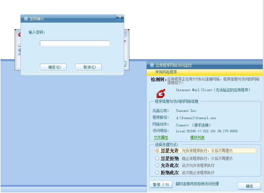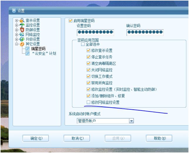 问题现象:勾选“修改网络监控设置”的密码保护后 在对瑞星的网络提示进行操作时 会要求输入密码