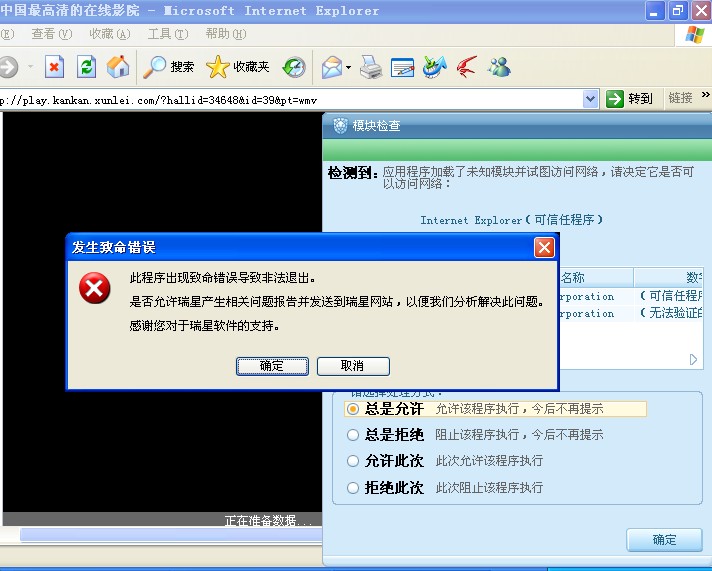 问题现象:在开启模块检查功能的状态下,看迅雷在线电影时,弹出连网提示,按确定之后,仍多次弹出,后来就出致命错误了。