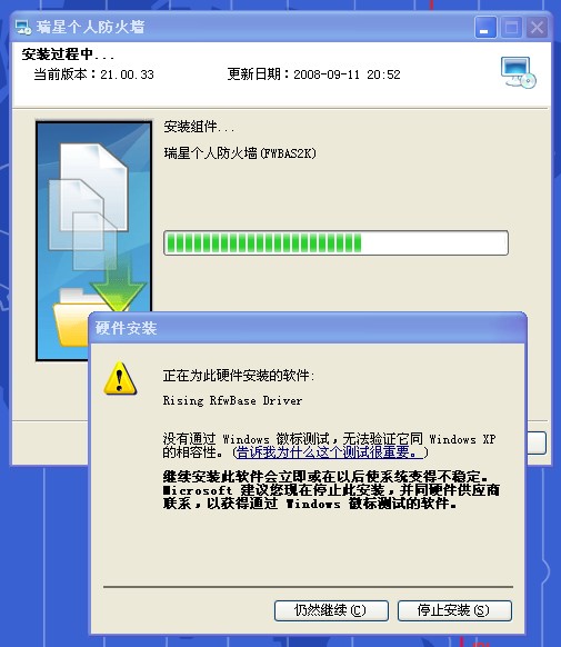 卸载旧版,安装瑞星防火墙2009问题能否复现:必现