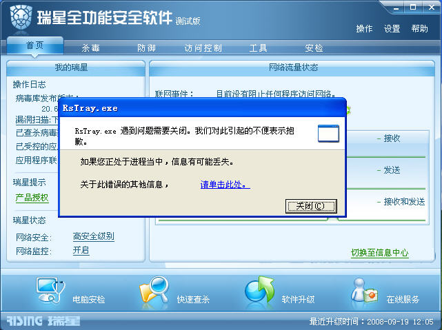 本人在测试杀软2009也遇到此问题,因杀软与防火墙2009均无法升级,所以测试此全功能软件,问题照旧!!!虽说期盼全功能的瑞星好久,但感觉出现此问题确有不应该之处,希望尽快改正。尤其是21.00版本杀软及防火墙的升级问题。