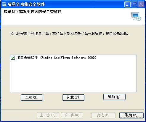 全功能安全软件已经含有杀毒软件的功能,所以会要求卸载以前的版本。请卸载后,再安装全功能安全软件。