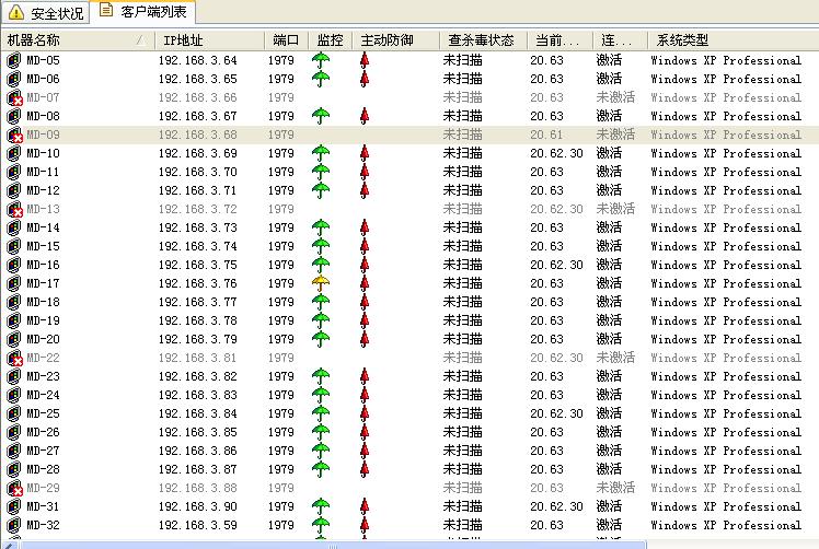 我的网络版(企业版)最近有很多客户端在控制台那里显示不在线,这样就无法对相应的客户端进行升级与控制,我查看了客户机的相关服务,都没有什么异常,这是什么原因。就像图中的MD-09和MD-22这样