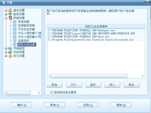 使用IBMThinkPad笔记本的RIS用户须将cssauth.exe加入防御设置的“自定义白名单”中(图)。否则,系统启动后无法完成指纹识别(系统反复报错)。