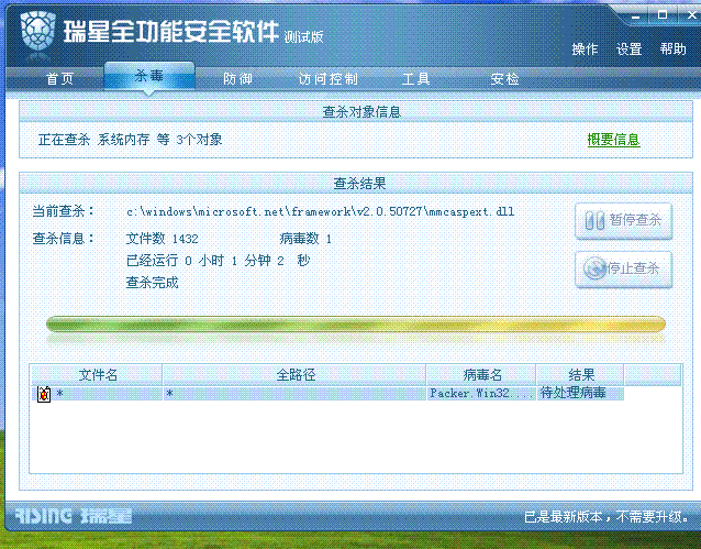 瑞星软件版本:瑞星全功能安全软件测试版,程序版本:21.00.30 (应该在界面显示版本,现在只能移动鼠标到右下角的小伞才显示)