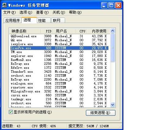 问题现象:手动操作“空闲时扫描”结束后,任务管理器中scanfrm.exe占用内存居高不下。