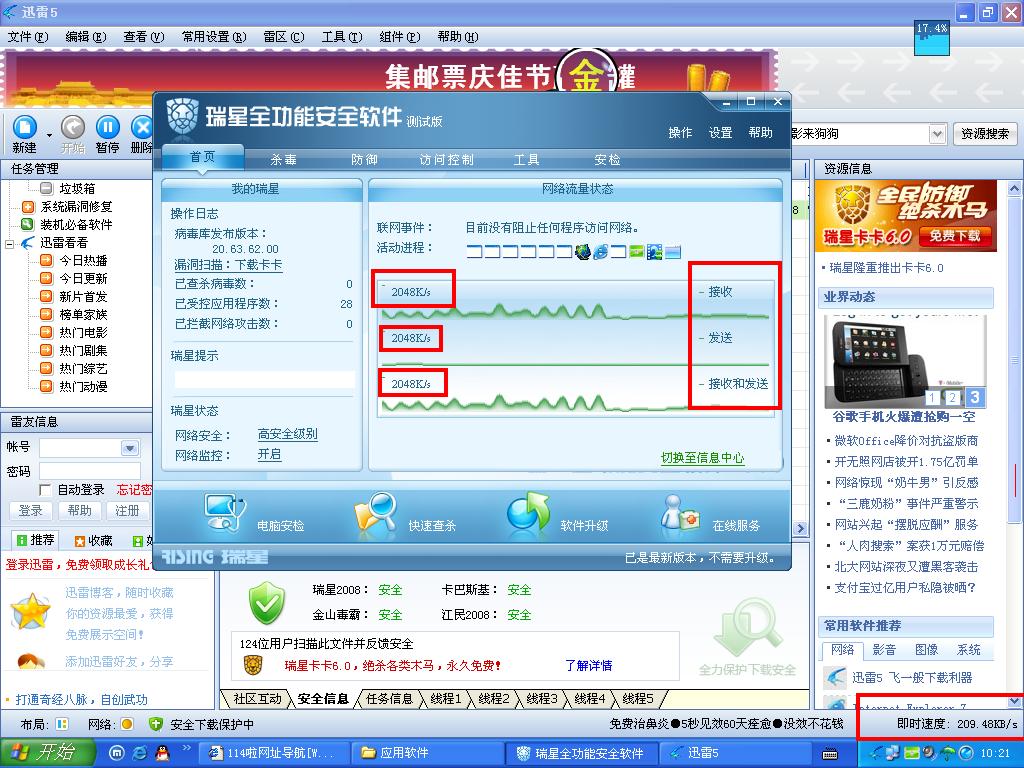 http://bbs.ikaka.com/showtopic-8552945.aspx2、如图,我只开了迅雷,他速度显示只有200多k,但是瑞星显示有两千多k