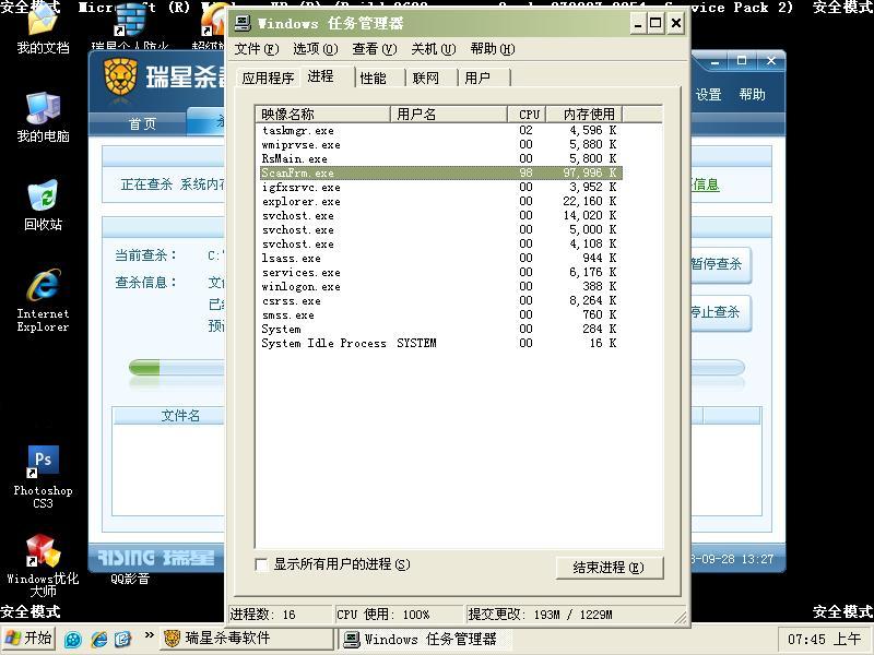 问题现象:瑞星在安全模式杀毒占用cpu居高不下