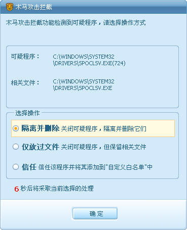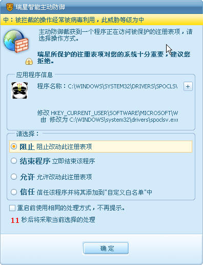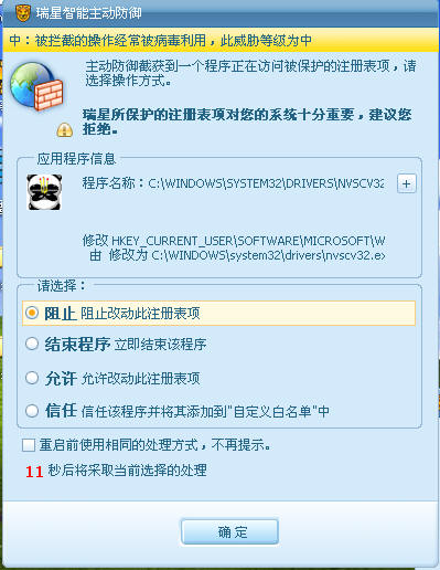 瑞星杀毒软件弹出了主动防御的提示框,选择阻止(不结束程序)