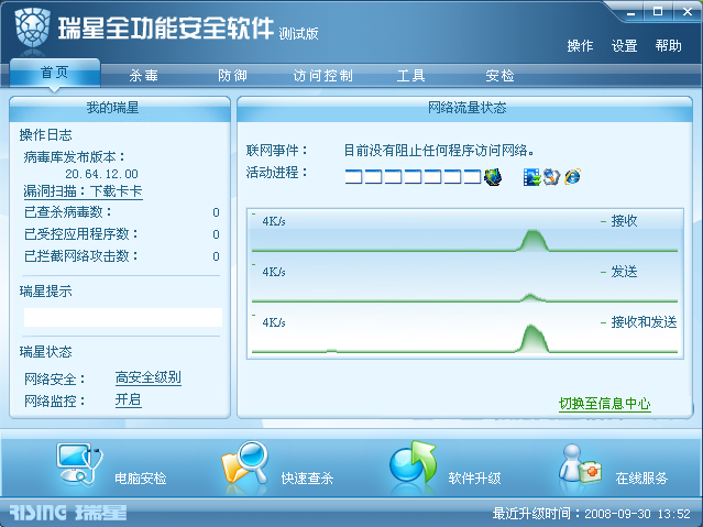 既然是全功能软件就应该加入瑞星所有的技术,包括卡卡,假如功能有重叠,应该做适当删减后添加进去。还有就是应当重新制作监控图标,绿伞给人的感觉还是单独的杀软,没有什么新意。主界面我认为网络流量图还不如信息中心看得舒服,可以改为默认信息中心