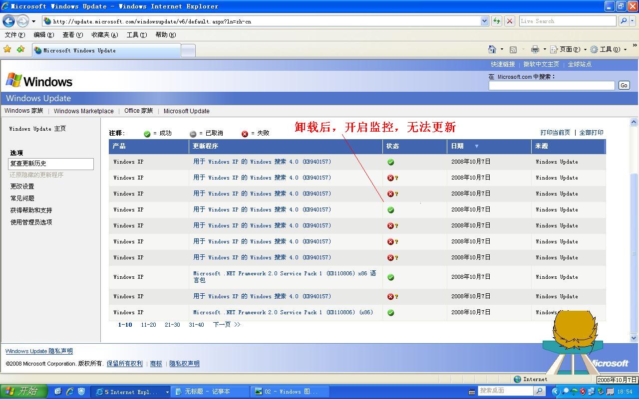 操作系统及补丁情况:XP SP3,截止到08年10月7日的所有补丁,除Windows 搜索 4.0 (KB940157)