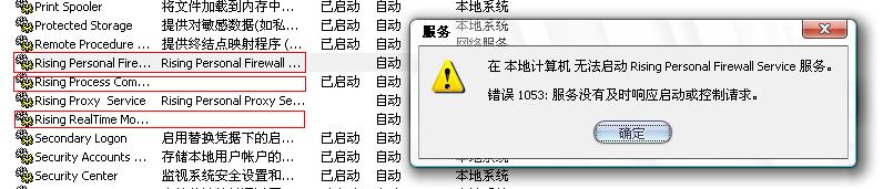 在服务里看到瑞星的几个服务没有启动,我手动启动的时候提示我“在本地计算机无法启动Rising Proxy service 错误1053:服务没有及时响应启动或控制请求”还有“在本地计算机无法启动Rising Personal Firewall service 错误1053:服务没有及时响应启动或控制请求”