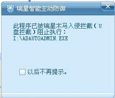 楼主在主动防御/木马入侵拦截(U盘拦截)里设置是”直接拒绝“,可以设置为”询问我“后,瑞星会提出提示,选择允许后,就可以正常使用。