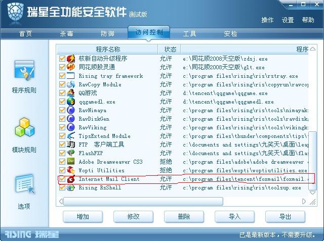 正常情况下foxmail连不了邮件服务器, 禁用瑞星所有监控后foxmail可以连上,以前我单用独防火墙时没这种问题!有人会说这人不用防火墙,我防火墙里设置的是对foxmail放行,我不用其它杀软的原因也就在这个防墙上,现在放行还是连不上!