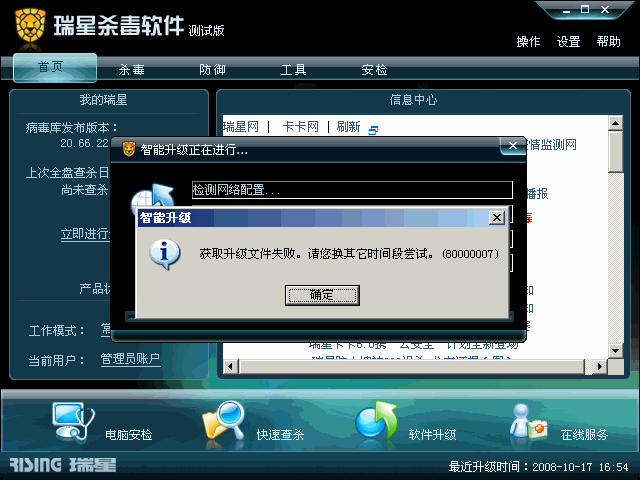 首页 » 企业产品讨论区 » 瑞星2009公测 » 瑞星2009测试版问题反馈 » 瑞星杀毒软件2009公测 » 无法升级~~~