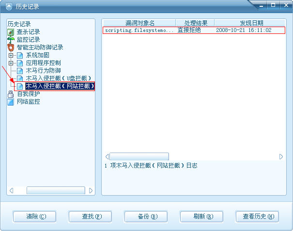 打开“瑞星全功能安全软件2009体验版,依次点击“操作”→“历史记录”,展开“智能主动防御记录”,选择“木马入侵拦截(网站拦截)”,在右侧窗口即可查看所有拦截上报历史记录;
