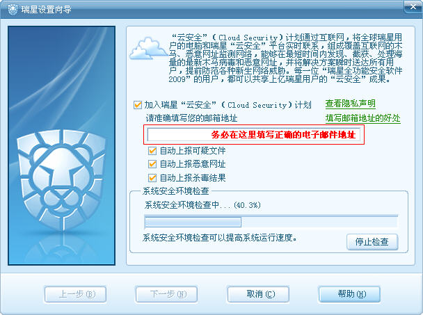 1、在设置向导中勾选“加入“瑞星”云安全计划”、“自动上报可疑文件”、“自动上报恶意网址”、“自动上报杀毒结果”,并填写您的邮箱地址