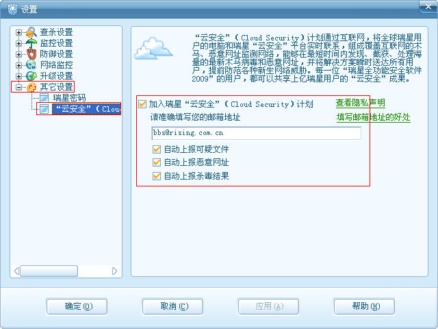 3、确认您已加入瑞星“云安全”计划,邮箱地址填写无误