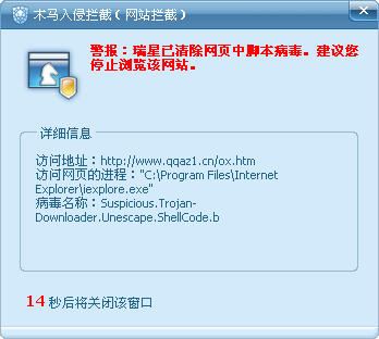 4、使用IE或其他IE核心浏览器正常浏览网页,当访问存在恶意行为的网页时,将会被瑞星软件拦截