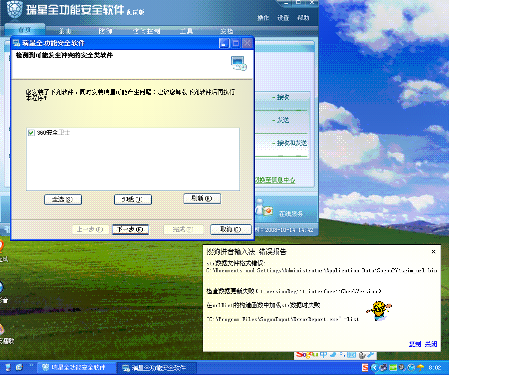 升级过程中,需要卸载360安全卫士,才可以继续升级。当然,如果安装了瑞星全功能软件,没有必要要360安全卫士了。
