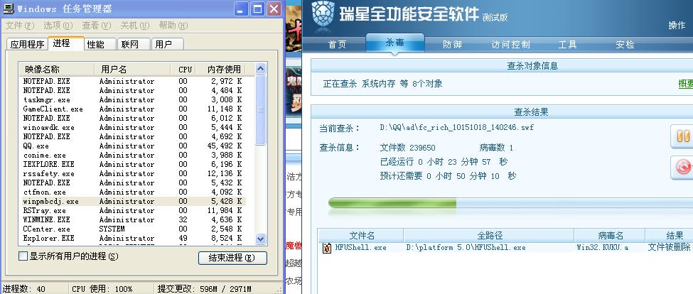 期待新的杀毒很久了。我的电脑中毒已经快一个星期了!是个叫win32.kuku.a的病毒。我用了很多杀毒软件,金山、江民、卡巴、瑞星、木马清道夫、都在断网的情况下进行安全模式下的查杀病毒!所有的杀毒软件都提示成功查杀病毒。然而直到目前为止这病毒依然存在于我的电脑。今天到了瑞星的官网上溜达,才发觉竟然已经有2009了,抱着试试看的态度,下载了该软件并安装。先说说这款软件给我的第一印象吧!外观更比以前漂亮了!各种按钮做得更比以前“人性化“了!因此我有种强烈的欲望想试试!安装后,我直接进入正常模式进行病毒的查杀!结果,让我大失所望!这是截图,大家请看!看见没有,winoawdk.exe,winpmbcdj.exe,winmine.exe。只要是常整电脑的人一眼就看出这是病毒。然而,杀毒软件都已经查到D盘都,都还没有发觉该病毒。单此一点我都开