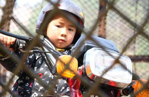 江西南昌飞龙神童艺术团艺名叫小小飞天的小演员正准备表演环球飞车(图)。小小飞天出生于2002年4月,四周岁能表演环球飞车时,身材还没有表演的摩托车高。