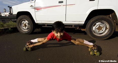 6岁的印度小男孩AniketChindak在45秒内从57辆小车下通过。既要保持一定滑行速度,同时还要保持身体在不到8英寸的高度下平衡滑行。AniketChindak出生仅18个月就开始练习滑旱冰,每天要练习4小时。现在他每周练习96.5公里,下一个目标是创造100辆轿车下滑过的记录。
