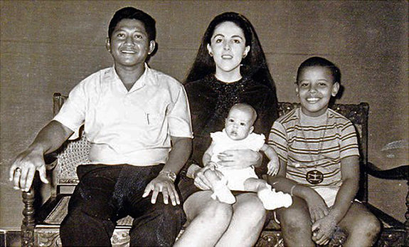 奥巴马除了在印度尼西亚呆了几年,其余时候都在夏威夷。这张照片是在雅加达拍摄的,那年他9岁。照片上的人是妈妈,继父罗罗·素托罗(Lolo Soetoro),和小妹妹玛雅。