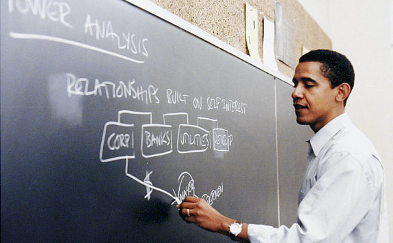 1985年,奥巴马到了芝加哥。在那里他成为了一个以教堂为基础的团队的组织者。(这张照片是奥巴马从哈佛法学院回来后给芝加哥法学院学生做演讲的时候拍摄的)