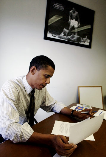 2004年,奥巴马竞选美国参议员。在他的竞选中,他被提名发表民主党集会的政策演讲。奥巴马正在穆罕默德.阿里的照片下准备自己的演讲稿。