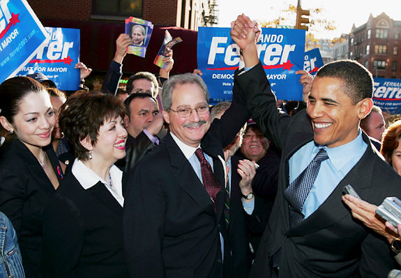 在2005年纽约市长选举的前夜,奥巴马和民主党候选人佛瑞德.费雷尔(Freddy Ferrer)在一起。后来费雷尔输给了当时的市长麦克.布卢姆伯格(Mike Bloomberg)。