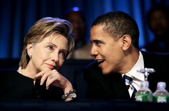 奥巴马和纽约州参议员希拉里.克林顿在2006年7月19日举行的全国有色人种协进会上交谈。他们两位在2008年的初选中展开了激烈的竞争。
