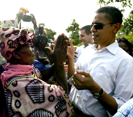 2006年8月,奥巴马到了自己生父的家乡-非洲。照片上,他和自己的祖母莎拉.海森.奥巴马(Sarah Hussein Obama)在生父的屋前击掌。