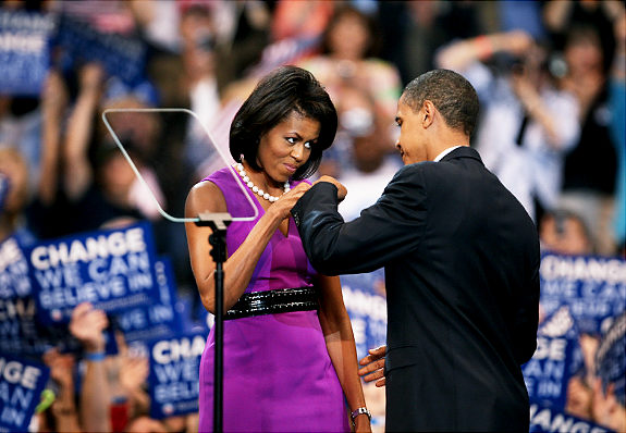 初选在6月3日结束,奥巴马得到了提名。他和她妻子米歇尔在明尼苏达州圣保罗中心击拳庆贺。