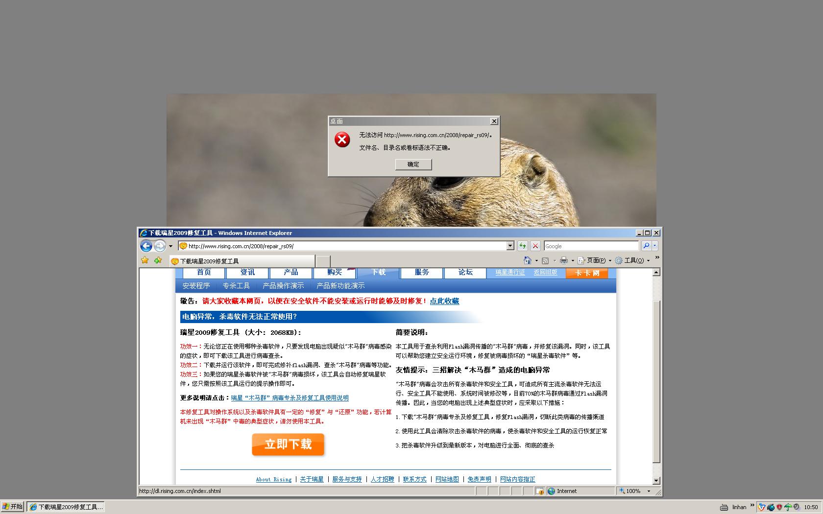 现象是桌面图标一下全没了。。。刷新桌面时出的那个对话框,告诉我某某网址打不开,下面的ie浏览器是后开的,证明这个网站明明能打开。不懂怎么回事。。。变相广告?