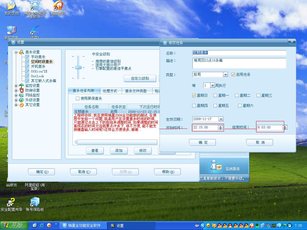 工程师你好,我在使用瑞星2009全功能版的测试,在使用中发些一个问题,就是用户在设置查杀时间的时候,只能通过点击上下的按纽来调整时间,如果调整的时间离现在的时间太远就要点许多下,很不方便,能不能支持键盘输入时间呢?这样会方便很多,谢谢..