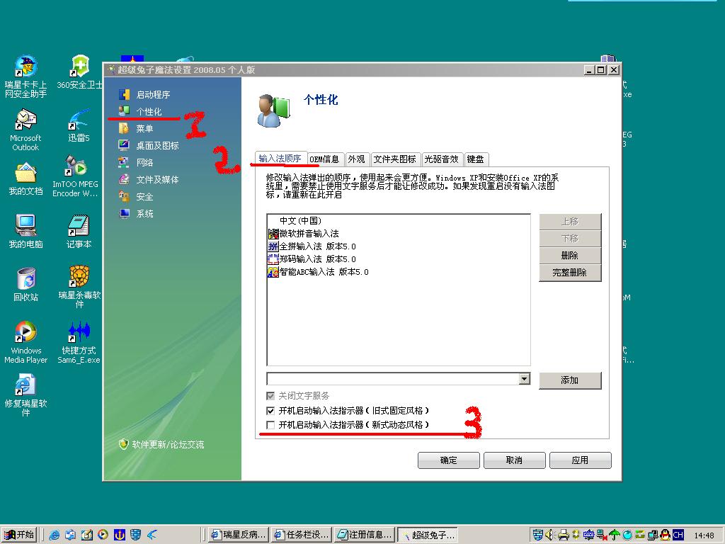 (二)我的电脑-控制面板-区域和语言选项-语言-详细信息-高级,把关闭高级文字服务前面的钩去掉。