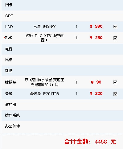 :default7: 楼上的把CPU换成E5200吧,会便宜不少,而且性能可以满足楼主的要求。显卡请问是4830还是4850,请楼上确认一下。光驱可以选先锋的,读盗版能力强,符合中国国情。:default6: 电源可以考虑换成航嘉磬石355U,一线城市价格应该230左右。