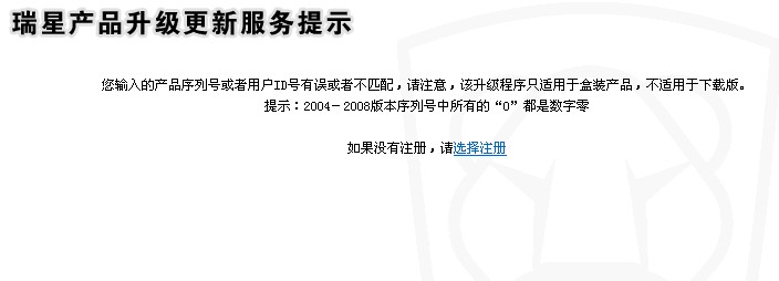 我的瑞星是盒装版的说明书带序列号和ID为什么在安装是时候序列号和ID都可以用在官网注册升级的时候为什么总提示序列号和ID不匹配啊!还有在升级的时候还总提示以是最新版本一直升不了怎么解决啊?