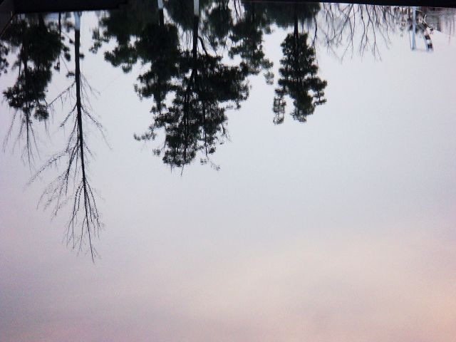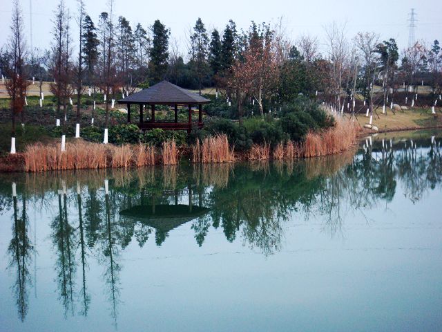 虽然已是冬天的傍晚,但是河岸树木等物体在水中的倒影依然清晰可辨