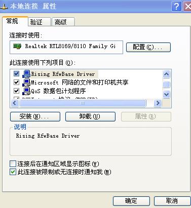 升级到瑞星全功能杀毒软件2009, 一台电脑进行宽带连接,没问题。 若当中接了个路由器,本地连接显示受限制,无法上网!手动指定他IP地址和DNS服务器地址,就可以上网。发现本地连接这里多了一项Rising RfwBase Driver,这个到底有什么用的啊?