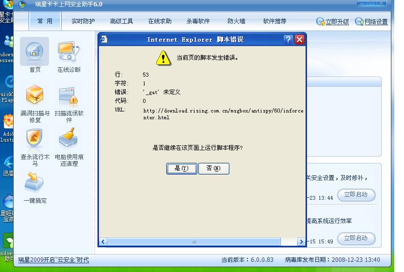 我的浏览器就是系统默认的。“禁止脚本调试”两个的勾选全部去掉了,但问题还是存在。启动卡后,其他的项目会马上显示出来,就是“信息中心”外的信息出来前就出现那样的提示了,选择“取消”后,信息提示就出来了,也不妨碍查看信息提示的各项。
