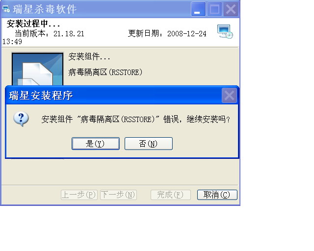 安装瑞星时,出现“安装组件病毒隔离区错误”,选择继续安装,表面上看起来安装成功,但重装或选择修复时仍然出现相同的错误提示,请问如何解决这个问题?不知道这是否和我以前安装诺顿有关