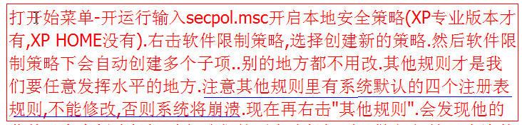 打开始菜单-开运行输入secpol.msc开启本地安全策略(XP专业版本才有,XP HOME没有).右击软件限制策略,选择创建新的策略.然后软件限制策略下会自动创建多个子项..别的地方都不用改.其他规则才是我们要任意发挥水平的地方.注意其他规则里有系统默认的四个注册表规则,不能修改,否则系统将崩溃.现在再右击"其他规则".会发现他的菜单里有个新路径规则.好我们就要在路径规则里做文章.这里允许使用通配符",""?""%"比如"%windows%"就表示c:\windows d:\windows等不管你windows文件夹在哪个分区,都给你认出来.