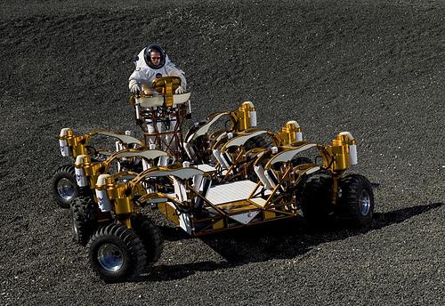 5. 宇航工程师 Dustin Gohmert 开着 NASA 新的月球车样机通过约翰森宇航中心类月地形场 , 此物可旋转至 360 °任意方向 , 无论轮胎朝向