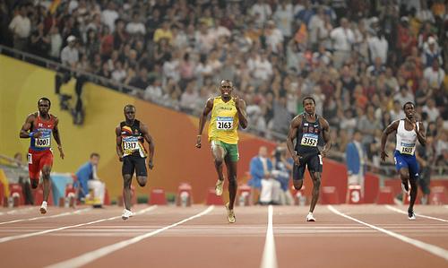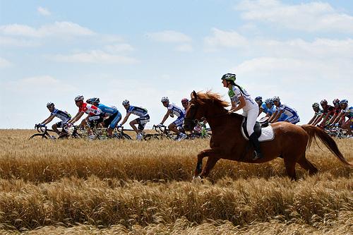 6.July 9, 2008. 一个女性在法国沙托鲁与环法自行车赛手并行奔驰