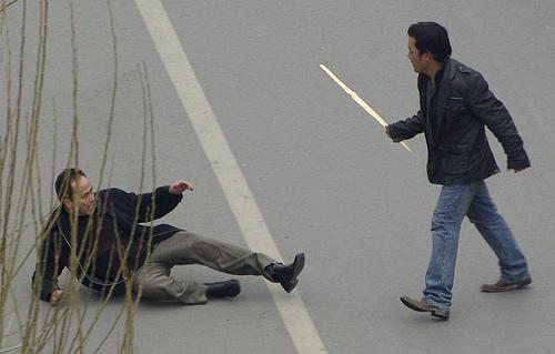 7.March 14, 2008. 一个藏人准备用棍棒攻击倒在地上的汉人