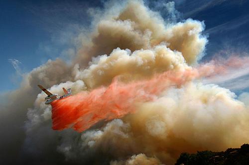 9.July 3, 2008. 一架救火飞机投放阻燃剂分割山火 . 加州中北部有大约 680 平方英里遭火灾