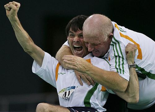 19.Sept. 9, 2008. 爱尔兰的加布里埃尔雪莱与教练庆祝赢得铜牌 , 他在残奥会中战胜了中国选手 Wang Yi 于硬地滚球比赛
