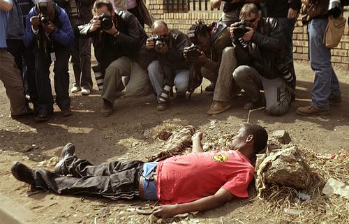 , 2008. 摄影师们在拍摄因南非排外冲突中受伤的男子 . 在镇压排外暴力中 , 南非警察对棚户居民使用橡皮子弹 , 导致超过六十人死亡 , 几百人受伤