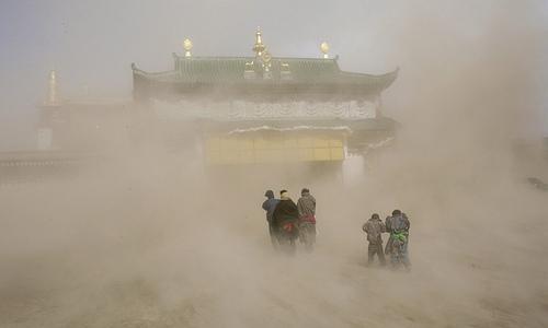 23.February 17, 2008. 四川阿坝的 Z 族信徒在沙尘暴中进入寺庙庆祝大祈祷节 , 这是 Z 传佛教一个重要节日